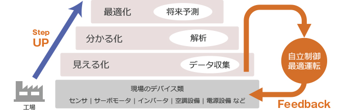 このように先進的なFA化を実現するためには、まず現場の状況を把握(見える化)し、課題となる原因を突き止めて(分かる化)、将来を予測しながら工場全体を継続的にうまく回していくこと(最適化)が最終ゴールになります。しかし、いきなり一足飛びに第3ステップにまで進む必要はありません。図のように、一歩ずつ段階を踏みながら最先端のFA化を進めていくことが重要なポイントです。