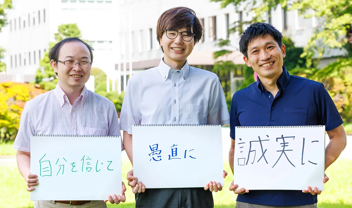 3人に学生へ向けてひとこと書いてもらった。長田(左)は「これまでの経験は必ずどこかでつながります。若い皆さんは“自分を信じて”進んでほしいです」。大嶋(中央)は「人の役に立てるような働き方をしたい。まずは“愚直に”勉強する姿勢が大切だと思います」、桐生(右)は「安易に流されず、真摯に対応する。いつもお客様に“誠実に”向き合って、研究開発に臨んでいます」と話した。