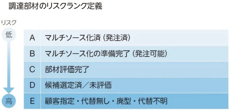 継続発注する部材約20万点についてリスク評価を実施し、シングルソース品の可視化とマルチソース化を推進しています。2024年度は約85%(対前年+5ポイント)の調達対象品目のマルチソ-ス化を確立しています。2025年度はマルチソース化率90%とシングルソ-ス品の撲滅のための新規開拓を推進し、強靱なサプライチェ-ン構築を目指します。